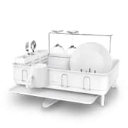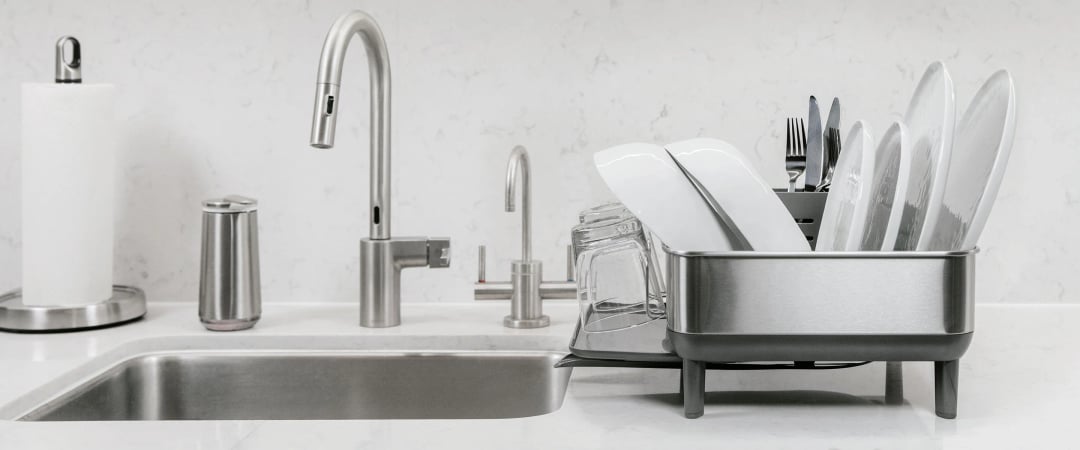 simplehuman bulaşık rafları hızlı ve düzgün bir şekilde boşalır - su birikintisi, su lekesi veya kalıntı bırakmaz. Bulaşıklığı nasıl yerleştirirseniz konumlandırın, lavaboya boşaltmak için döner bir musluğu bile var.